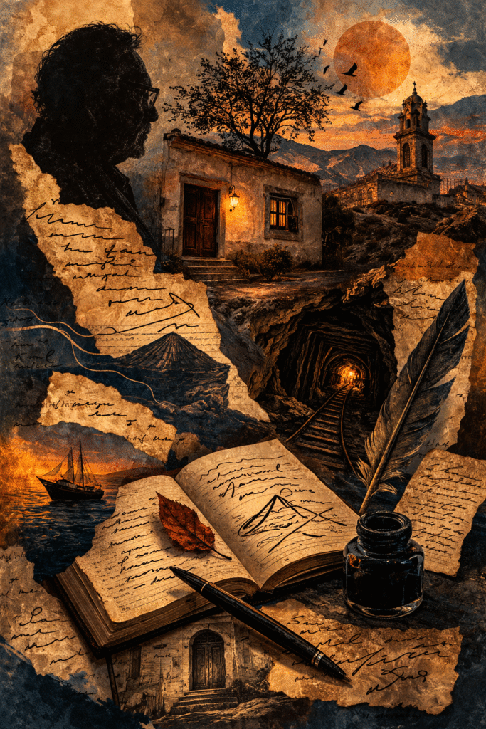 En la novela Las minas del retorno, Carlos Montemayor cae–retorna hacia sí mismo poéticamente a través de su decir y sus personajes. Escarba la tierra de su infancia, de Parral, hurga desde su decir poético–narrativo. Cae–retorna y con la punta de los dedos roza lo abismal de la muerte que se proyecta en forma de mina, de profundidad abierta en lo terrenal y lo insondable: