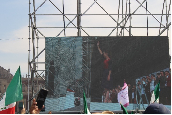 Finalmente, no queremos dejar de mencionar el acto violento y de franca provocación que presenciamos justo al término de la alocución de la comandanta suprema de las fuerzas armadas. Un hombre vestido de negro, con chaleco de color vino, comenzó a escalar la base donde fueron colocadas las bocinas cerca de la Catedral (que es donde alcanzamos lugar), al llegar a la cima, mostró una bandera mexicana con pintas en contra del gobierno, instantes después, se colocó una máscara con la imagen de López Obrador, sacó de su mochila una pintura roja, la abrió y se la echó encima desde arriba como simbolizando sangre y terminó haciendo gesticulaciones obscenas y señalamientos a los asistentes. Desde abajo podía sentirse la impotencia y el coraje hacia quien intentó generar violencia. Los curiosos mostraron su enojo y desapruebo a tales actos intimidatorios y violentos. Los bomberos y el ERUM acudieron para que no hubiera un percance mayor y lejos de atender el llamado con violencia, las autoridades capitalinas lograron hacer que el hombre bajara y fuera trasladado fuera de las inmediaciones del Zócalo en una ambulancia del ERUM para evitar un conflicto con los asistentes a la marcha. El hecho no pasó a mayores ni enturbió el ánimo de alegría con que la presidenta fue apoyada.