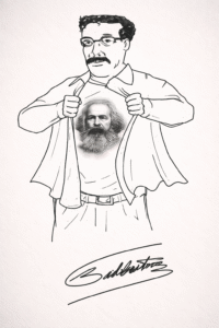 Hay un asunto que, al parecer, ha pasado inadvertido por los estudiosos de la biografía de Bolívar Echeverría: en las páginas finales de la antología que realizó la Vicepresidencia del Estado Plurinacional de Bolivia en 2011 (p. 801), como homenaje póstumo, hay dibujo de un Echeverría, al estilo de Supermán, abriéndose la camisa y mostrando a la altura del pecho una imagen de Karl Marx. Lo que realmente llama la atención es la firma que acompaña dicho dibujo, ya que no se menciona la autoría de este. Los editores y compiladores de la antología no se preocuparon por señalar la relación que puede haber entre el dibujo y la firma. ¿Echeverría conoció el dibujo? Si tenía conocimiento ¿quién se lo dio? ¿quién se lo hizo llegar? Más aún ¿la firma marca la autoría del dibujo?
